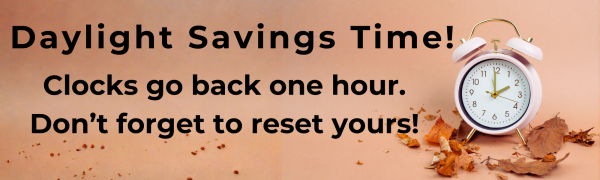 Sunday, November 2nd, brings us back into standard time. Don't forget to set your clocks back by one hour!