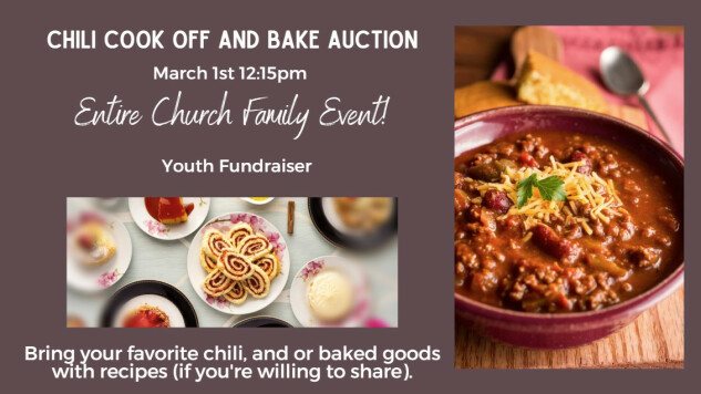Join us at 12:15pm in the Cafe following second service for this youth fundraiser. Bring your favorite chili, and or baked goods with recipes (if you are willing to share).